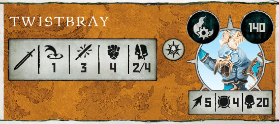 Other abilities – As this warband lack powerful Triples and naturally rolled Triples will most probably became Quads (Rampaging Pyrocaster can trim enemy chaff well) it leaves some spare doubles that you could use. One of such doubles can be spent to buff your Twistbray ally with Uttered Words of Arcane Power, but only in case of performing single attack action. With double attack actions Onslaught will probably be more usful.