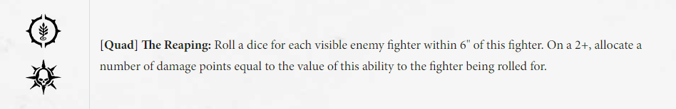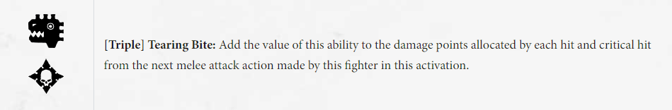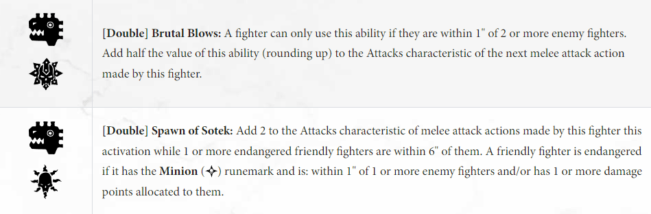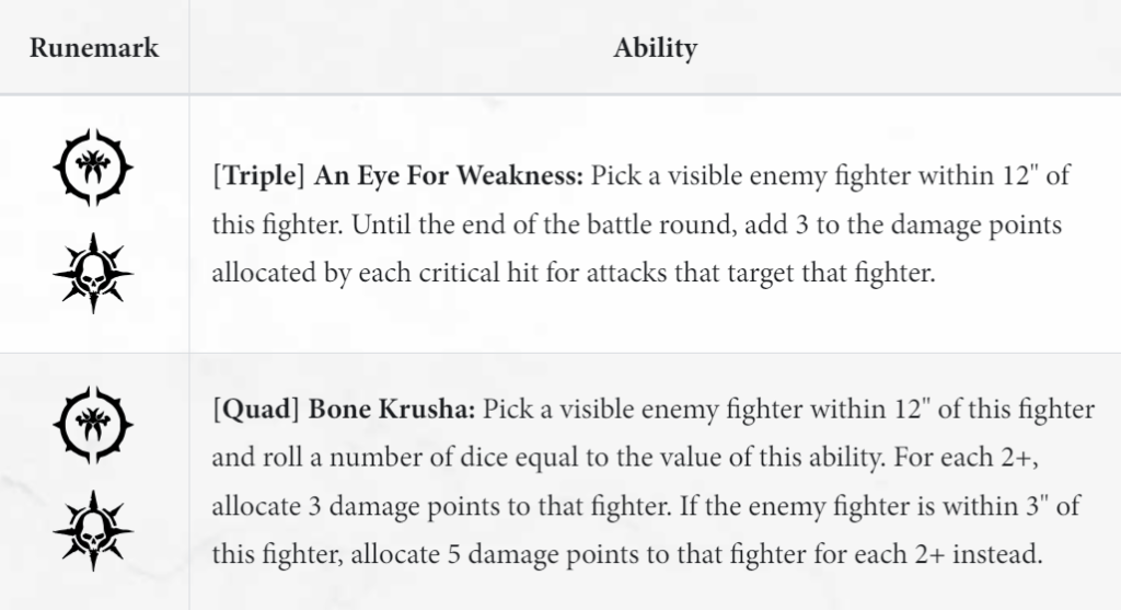 Ilusive weakness – A fighter can make this reaction when they are targeted by a melee attack action but before the hit rolls are made. Roll D3 and substract the result of the roll from this fighter Toughness value (to a minimum of 1). For each critical hit from that attack action substract the result of that roll from damage allocated to this fighter. If this fighter has no Minion Runemark add 1 to the roll.
