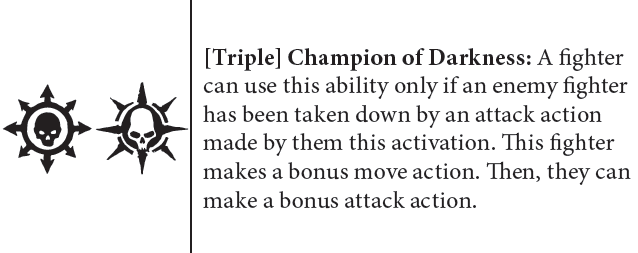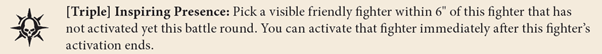 Changer of Ways – After finishing move action within 3″ of battlefield corner you can pick up your fighter and set it up within 3″ of opposing battlefield corner.