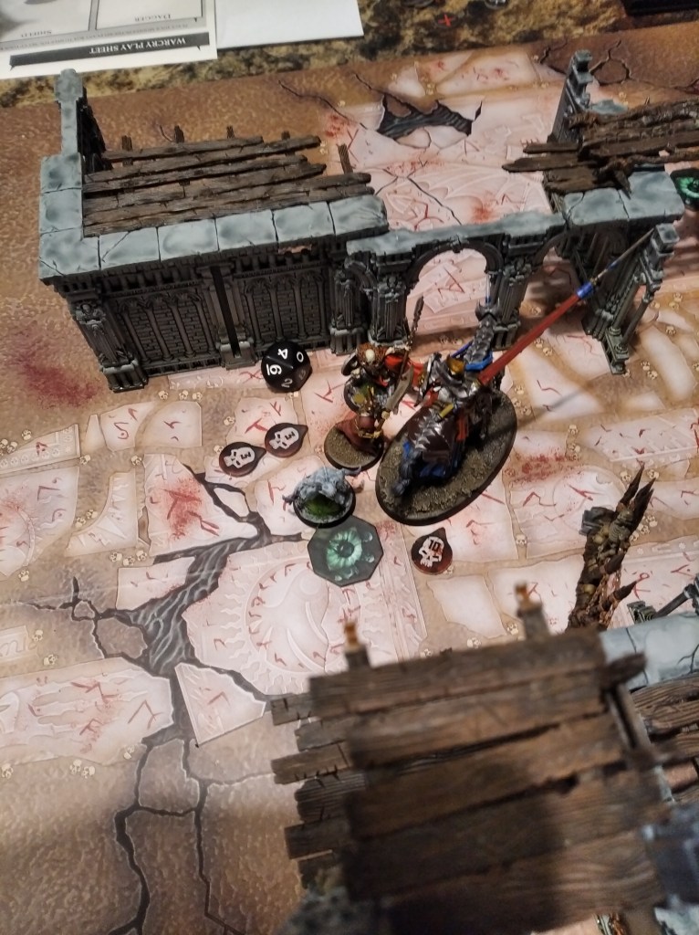 My opponent did exactly that and went in with Vaaranguard keeping his triple for Champion of Darkness but end up not using it as my Grave Guard suffered only 6 damage and survived. It was the end of his activations and with my remaining moves I took control of left objective with Dreadwarden (making sure that freshly appearing reinforcements (Dagger) can deploy in a “wall formation” around him so he is safe from Varanguard and enemy Shatterer. As my opponent did all of his activaations and none of my guys died I spend that triple to “Respite” my ghost healing him from 5 to 10 HP.