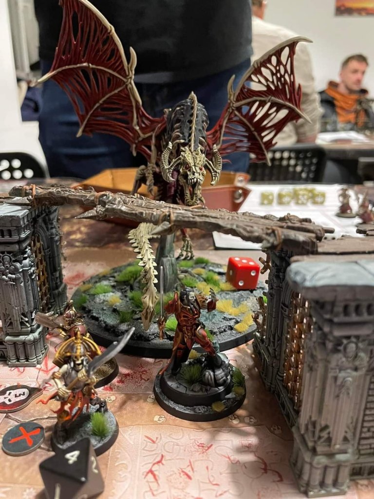 Round 3: early round 3 our time went out (we were both playing quite slow) and the judge decided that it will be a tie, which was fine for us both as I had point advantage but the Dragon and Vampire Lord being full health gave “board advantage” to my opponent. The only important thing in 3rd round was one of my Grave Guards getting on top of a platform on his way from right objective to the bottom one which resulted in me fulfilling my Hidden Agenda for this game (be the only player with fighters 3’’ or above the battlefield floor) and adding one point.