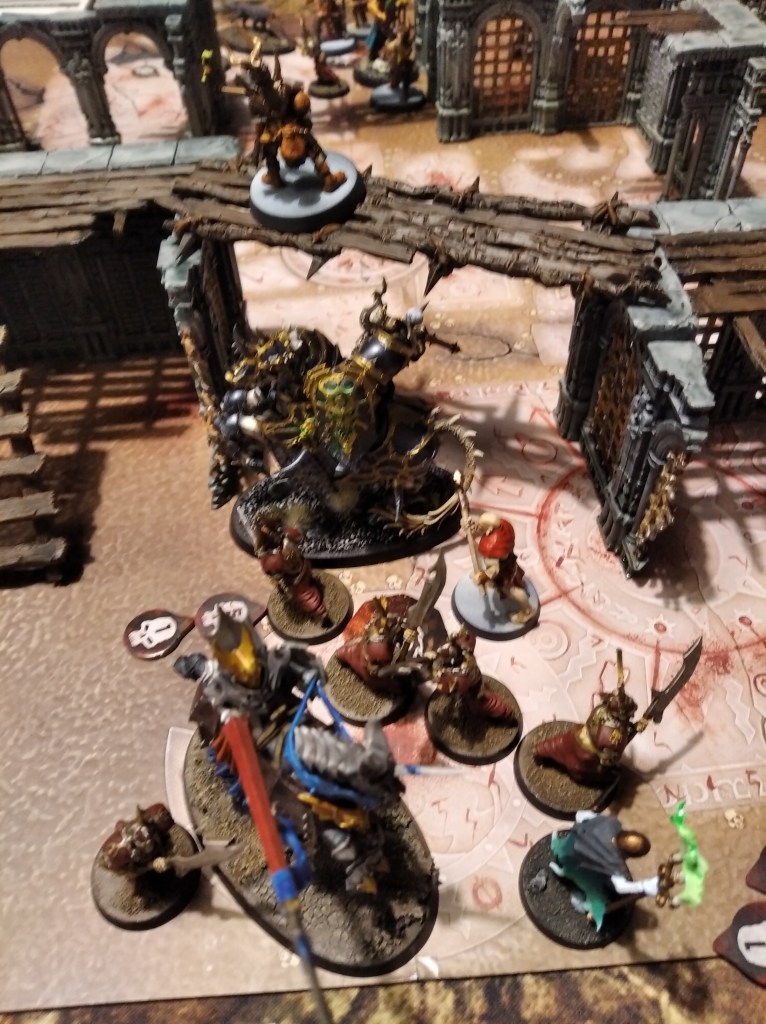 I was afraid of this board as a lot of dense terrain meant my slow fighters may have problems to get where I need them, but fortunatelly the opponent list was exactly what my list was prepared to deal with (7-8 models with 3-4 heavy damage dealers and some chaff around). I was very afraid of Flamehurler ability, that’s why all the fighters I deployed were never within 2” of my other fighters (some of them were on platform and some were on the floor level), I also made sure that my fighters that were deployed on top right part of the picture were difficult to reach with Slaughtepriest pull ability. The only doors in the long wall sections were on the bottom of the map near the objective.
