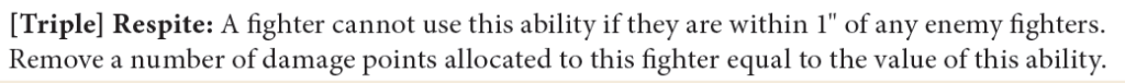 [Double] Horned Granade: Pick a visible enemy fighter within 6″ of this fighter and roll a number of dice equal to the value of this ability. For each roll equal to or exceeding the Movement characteristic of that fighter, allocate 2 damage points to them.